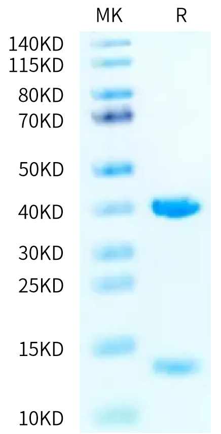 The protein has a predicted MW of 35.6 kDa (HLA-A*02:01) and 11.9 kDa (B2M) same as Tris-Bis PAGE result. |