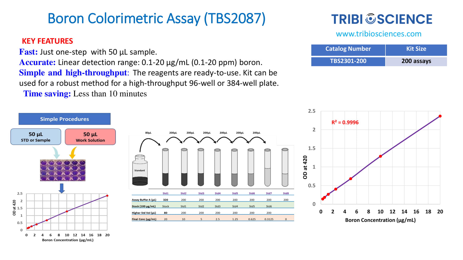 Fast: Just one step that takes less than 10 minutes. Accurate: Linear detection range of 0.1-20 μg/mL (0.1-20 ppm) boron in 50μL samples. Simple and High-Throughput: The reagents are ready to use. The kit can be used as a robust method for a high-throughput 96-well or 384-well plate.