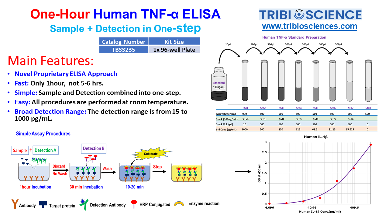 The TriboTM Fast Human TNF-α ELISA is designed to quantitatively detect Human TNF-α levels in different tissues including skin, muscle, neural, serum, and other biological samples. The main feature is that the kit uses our novel proprietary approaches to combine samples and detections into a one-step instead of the complicated traditional methods. It makes the assay simple, easy, accurate, and fast. The measurement can be finished in 3 hours instead of 4-5 hours (Fig. 1). The detection range is from 8 to 2000 pg/mL. The levels of human TNF-α samples are parallel to the standard curves obtained using the kit standards linearly. These results indicate that this kit can be used to determine relative mass values for natural human TNF-α protein.
