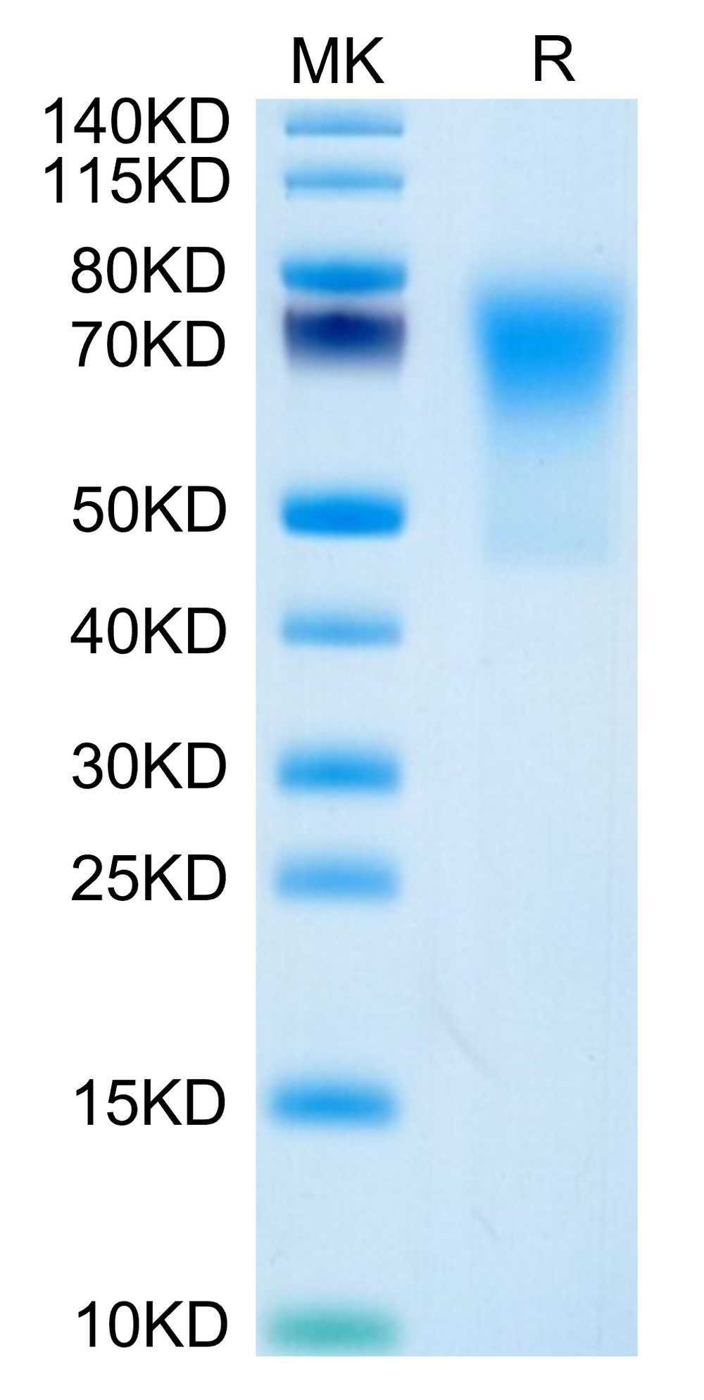 The protein has a predicted MW of 23.5 kDa. Due to glycosylation, the protein migrates to 60-80 kDa based on Tris-Bis PAGE result. |