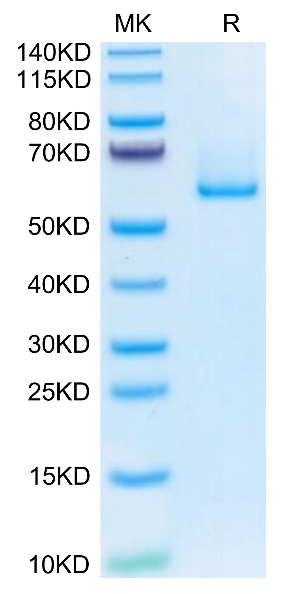 The protein has a predicted MW of 53.9 kDa. Due to glycosylation, the protein migrates to 55-60 kDa based on Tris-Bis PAGE result. |