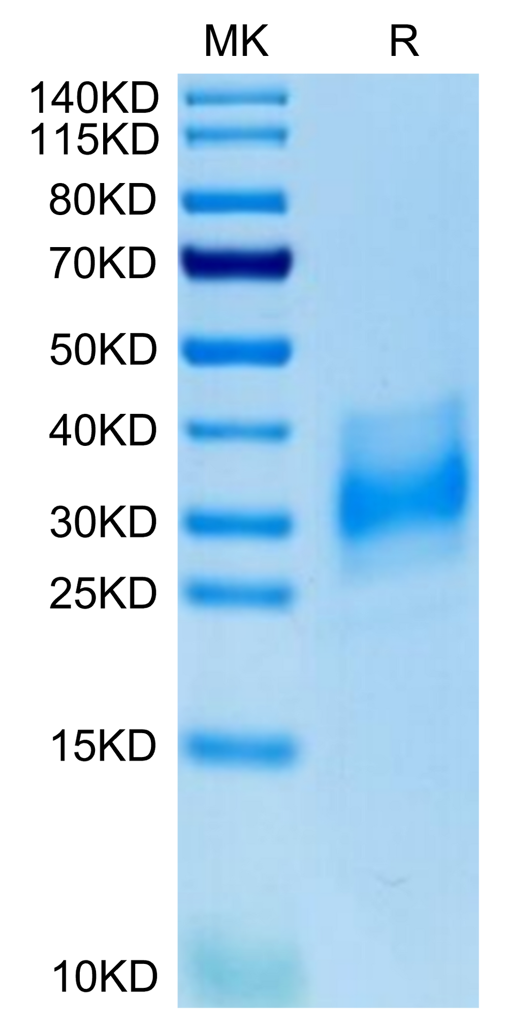 The protein has a predicted MW of 21.2 kDa. Due to glycosylation, the protein migrates to 28-40 kDa based on Tris-Bis PAGE result. |