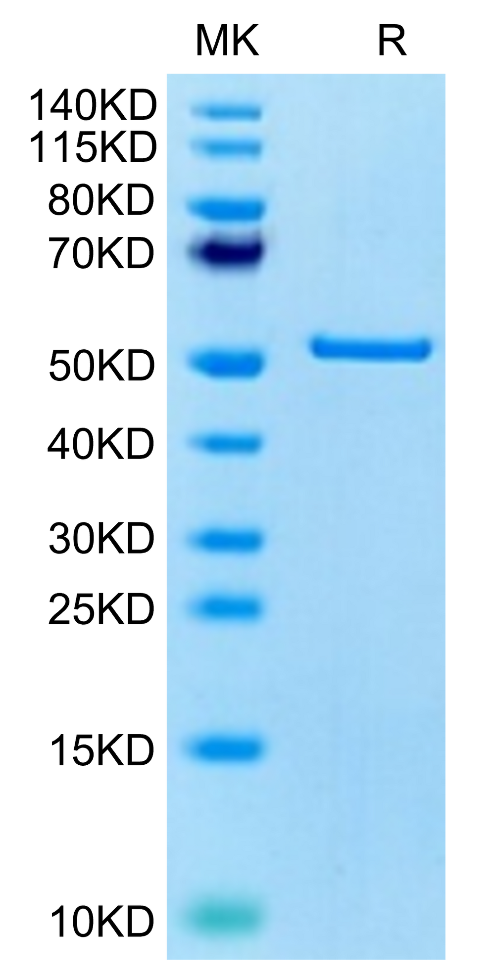 The protein has a predicted MW of 48.68 kDa. The protein migrates to 50-55 kDa based on Tris-Bis PAGE result. |