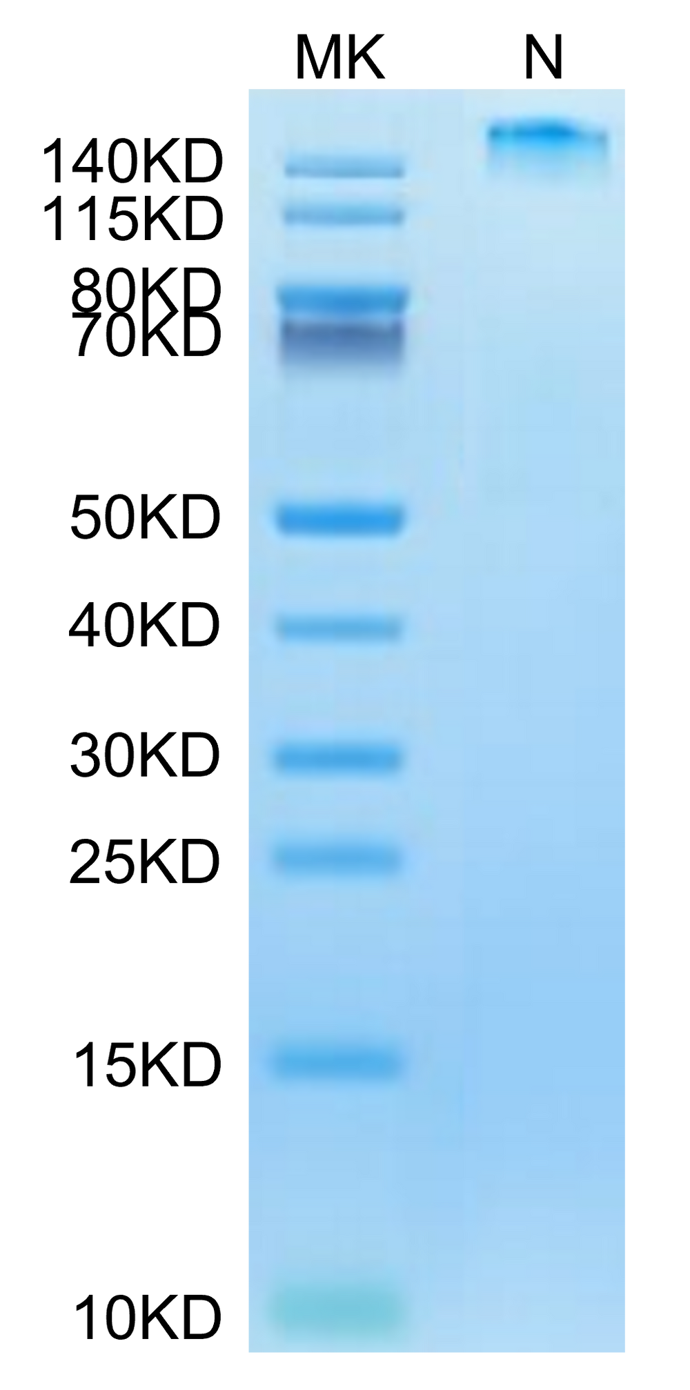 The protein has a predicted MW of 258 kDa. Due to glycosylation, the protein migrates to 260-265 kDa under Non reducing (N) condition based on Tris-Bis PAGE result. |