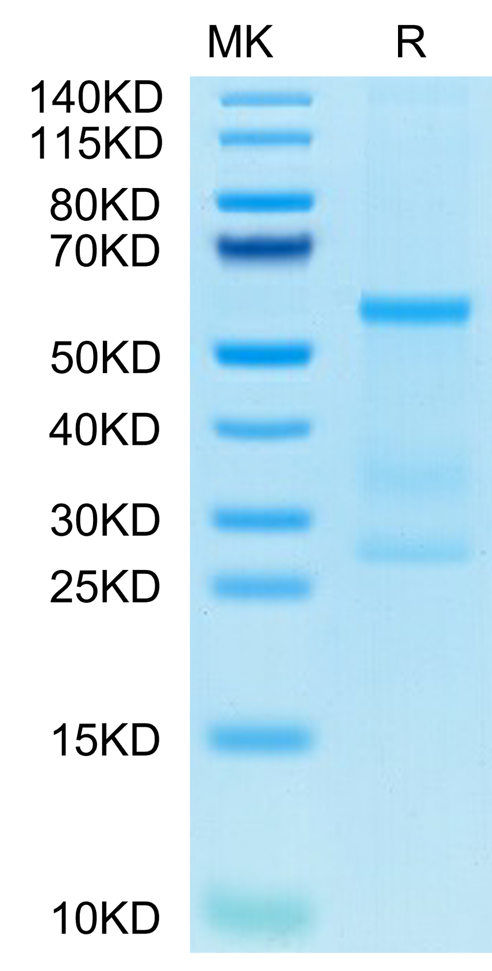 The protein has a predicted MW of 50.6 kDa. Due to glycosylation, the protein migrates to 54-64 kDa based on Tris-Bis PAGE result. |