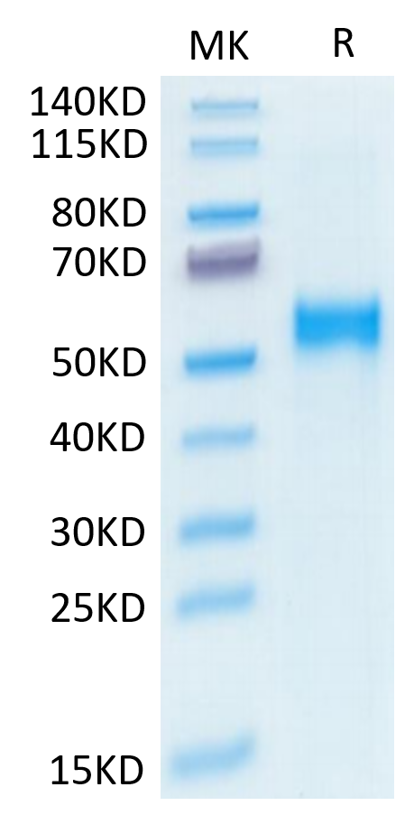 The protein has a predicted MW of 37.1 kDa. Due to glycosylation, the protein migrates to 50-60 kDa based on Tris-Bis PAGE result. |