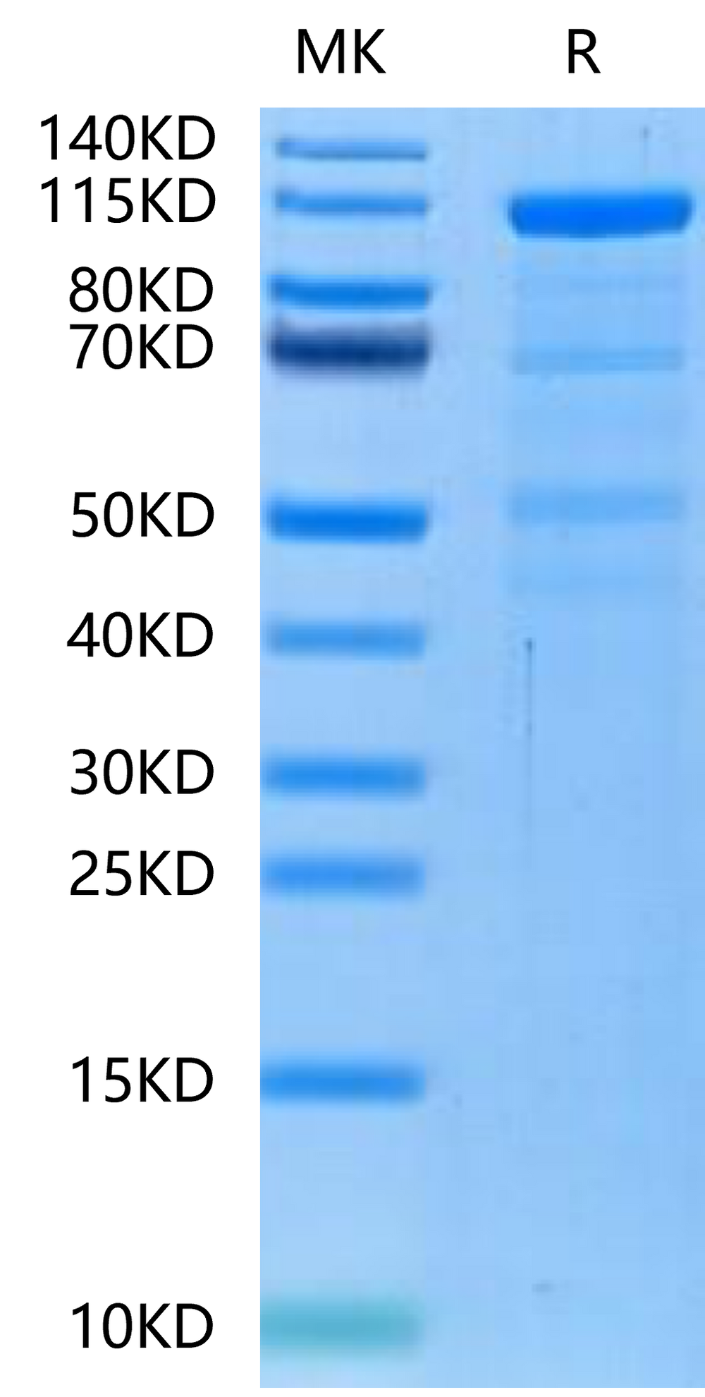 The protein has a predicted MW of 95.3 kDa. Due to glycosylation, the protein migrates to 110-115 kDa based on Tris-Bis PAGE result. |