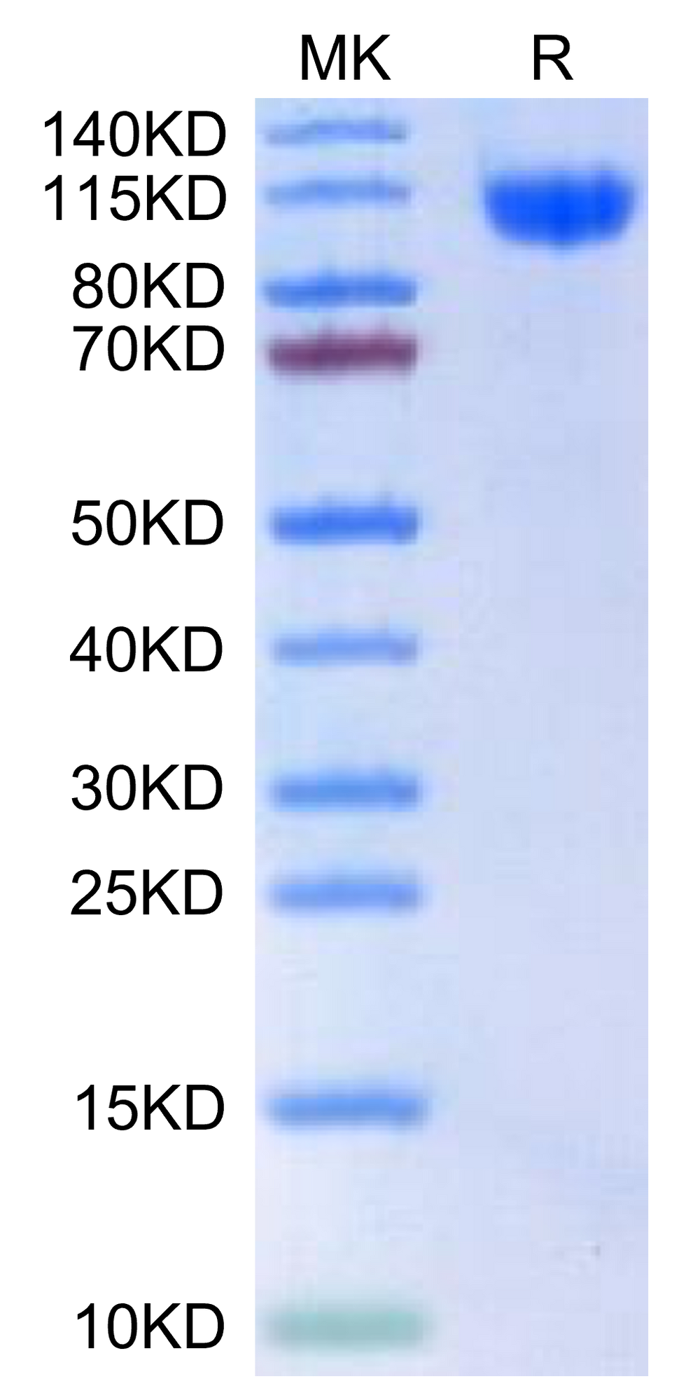 The protein has a predicted MW of 68.87 kDa. Due to glycosylation, the protein migrates to 90-120 kDa based on Tris-Bis PAGE result. |