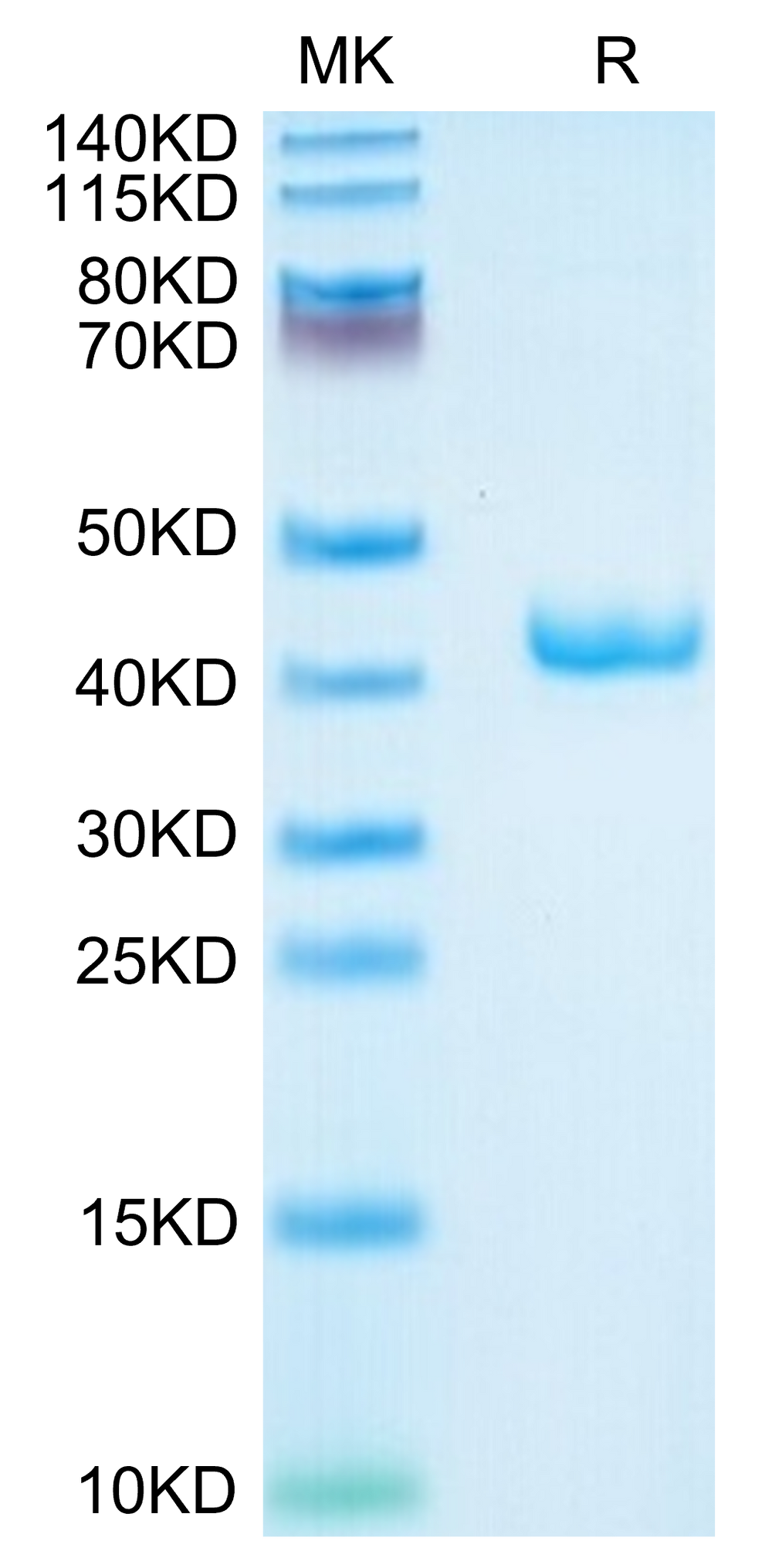The protein has a predicted MW of 36.2 kDa. Due to glycosylation, the protein migrates to 40-45 kDa based on Tris-Bis PAGE result. |