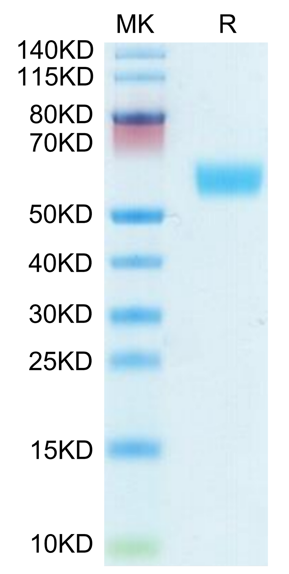 The protein has a predicted MW of 37.7 kDa. Due to glycosylation, the protein migrates to 53-60 kDa based on Tris-Bis PAGE result. |