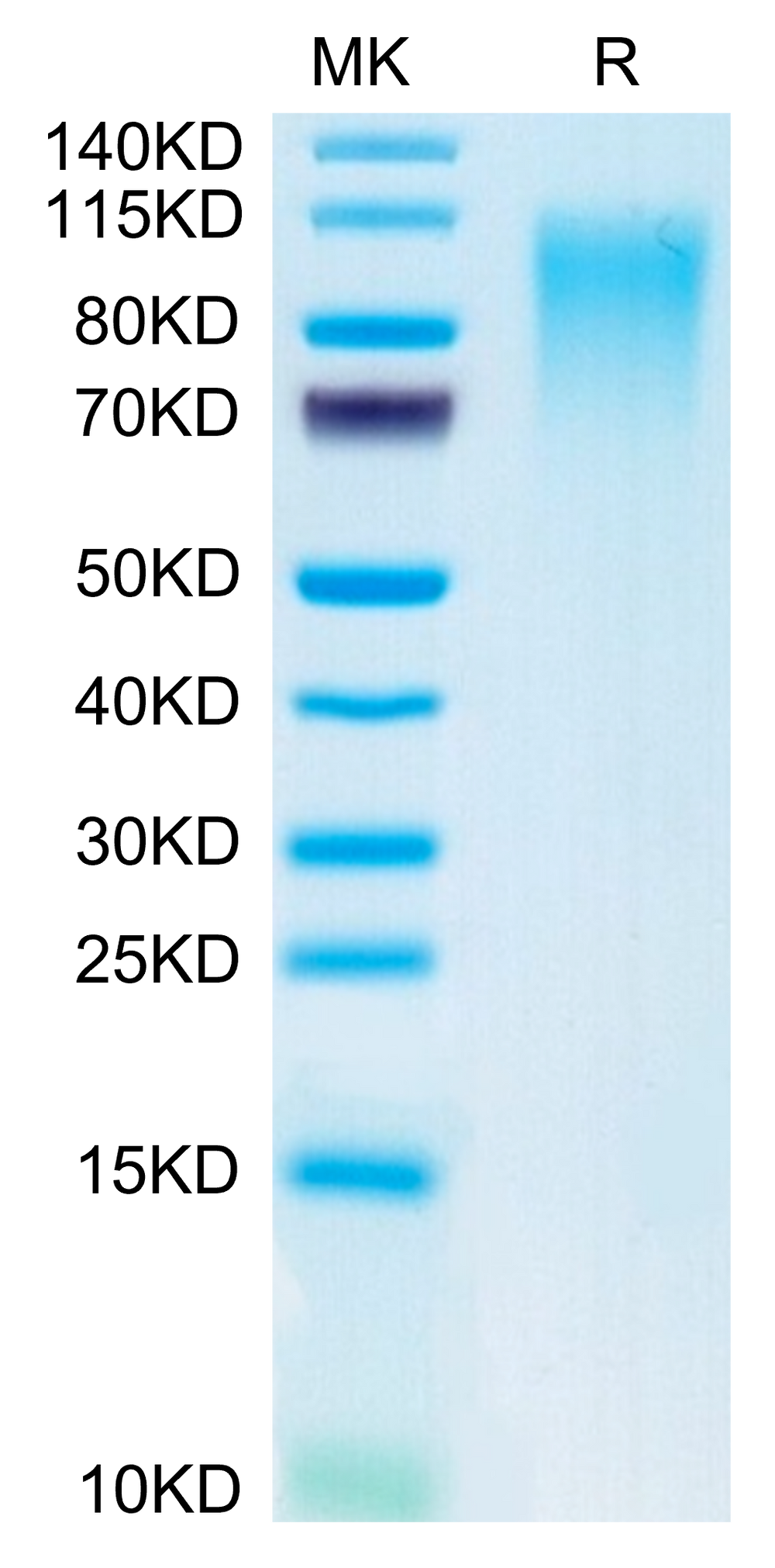 The protein has a predicted MW of 41.4 kDa. Due to glycosylation, the protein migrates to 70-115 kDa based on Tris-Bis PAGE result. |