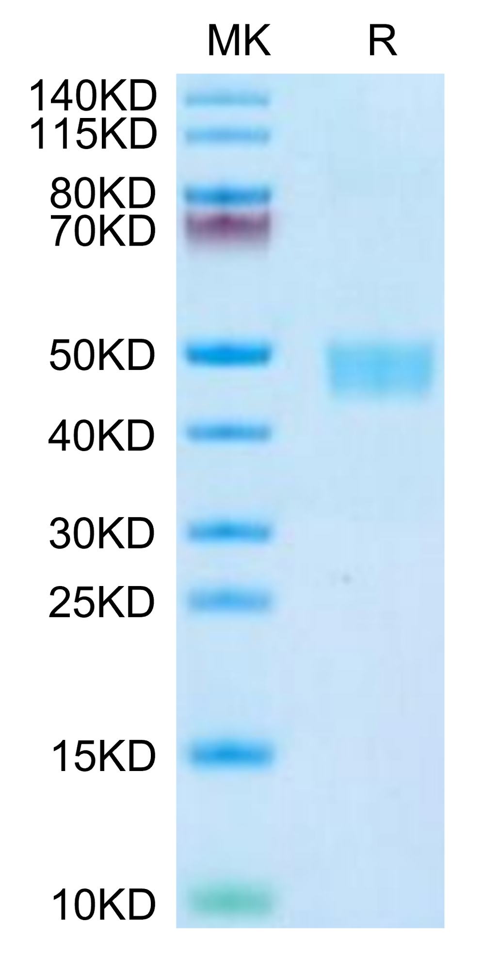 The protein has a predicted MW of 35.17 kDa. Due to glycosylation, the protein migrates to 43-53 kDa based on Tris-Bis PAGE result. |