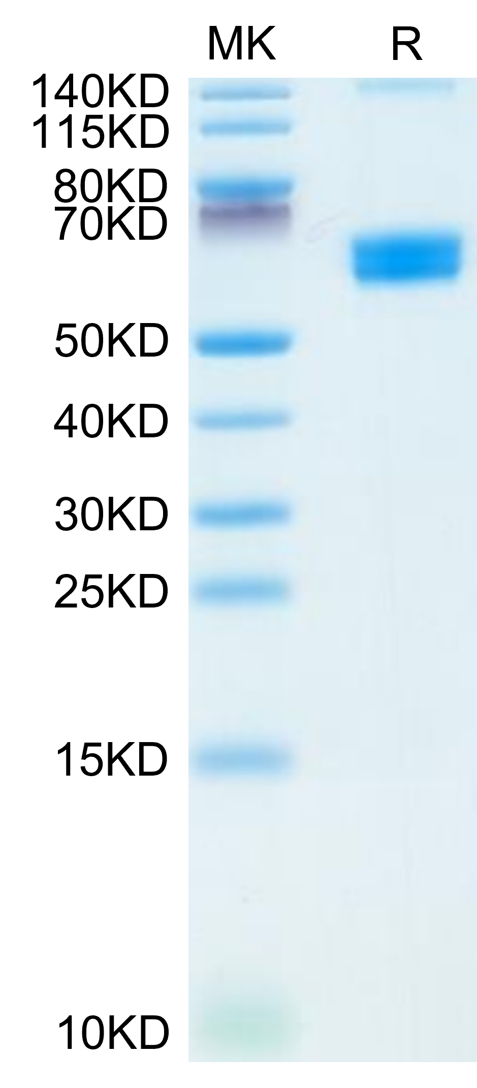 The protein has a predicted MW of 50.9 kDa. Due to glycosylation, the protein migrates to 60-70 kDa based on Tris-Bis PAGE result. |