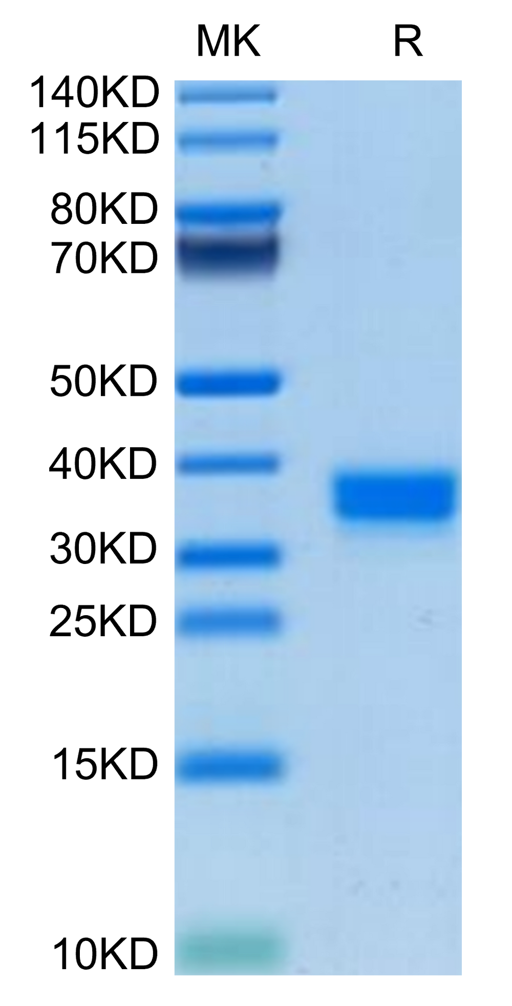 The protein has a predicted MW of 25.3 kDa. Due to glycosylation, the protein migrates to 35-40 kDa based on Tris-Bis PAGE result. |