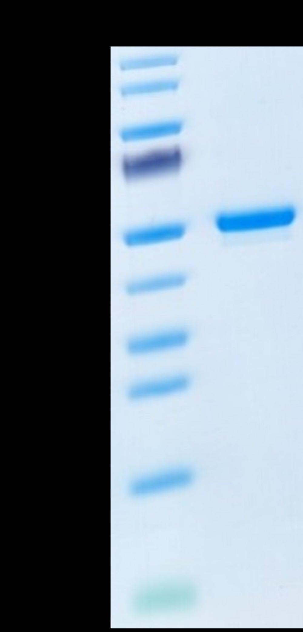 The protein has a predicted MW of 41.8 kDa. Due to glycosylation, the protein migrates to 50-60 kDa based on Tris-Bis PAGE result. |