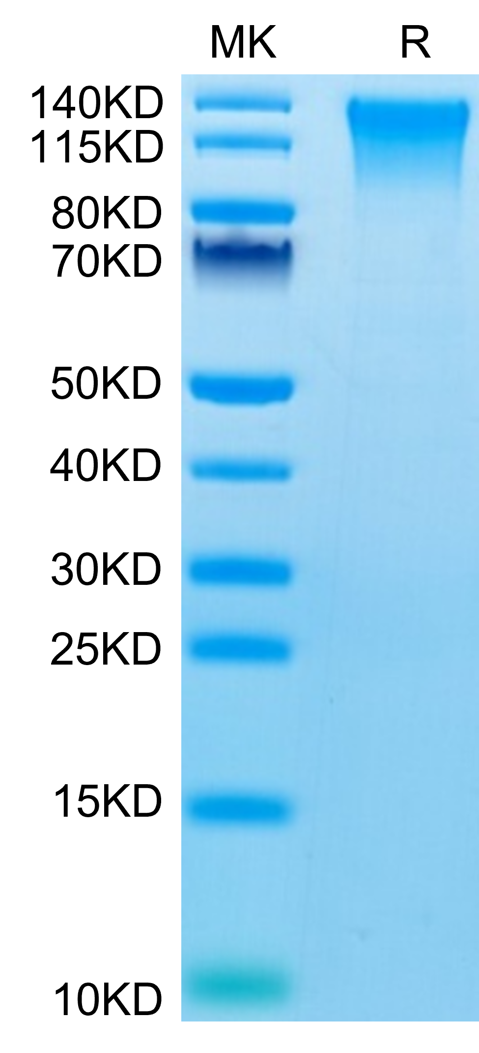 The protein has a predicted MW of 73.6 kDa. Due to glycosylation, the protein migrates to 75-140 kDa based on Tris-Bis PAGE result. |