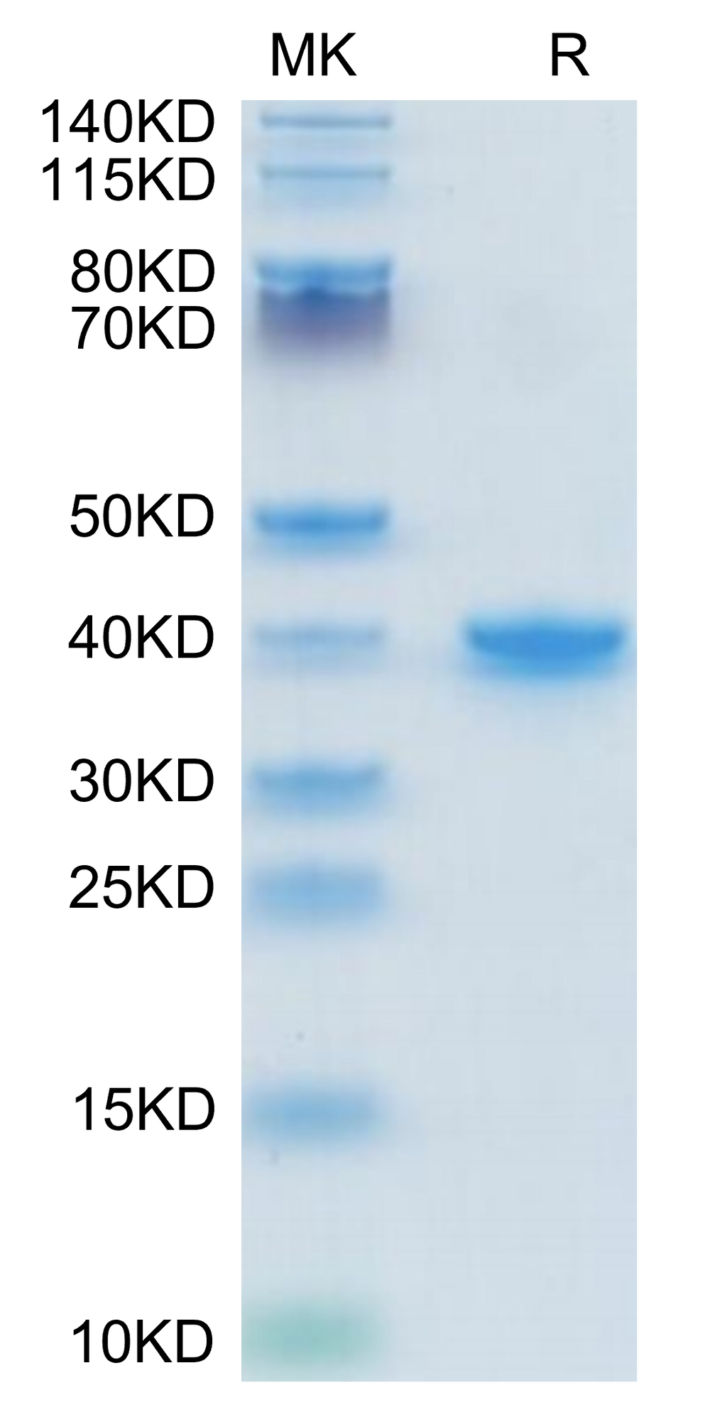 The protein has a predicted MW of 32.9 kDa. Due to glycosylation, the protein migrates to 38-42 kDa based on Tris-Bis PAGE result. |