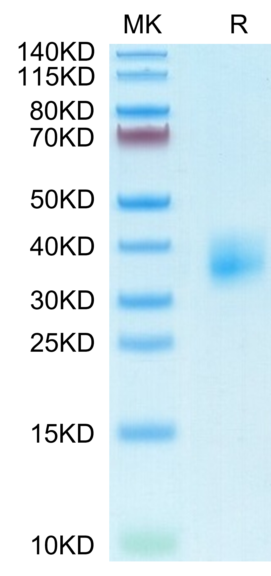 The protein has a predicted MW of 23.6 kDa. Due to glycosylation, the protein migrates to 35-40 kDa based on Tris-Bis PAGE result. |